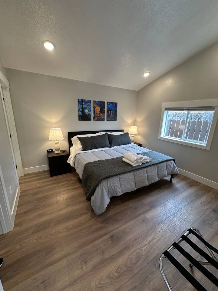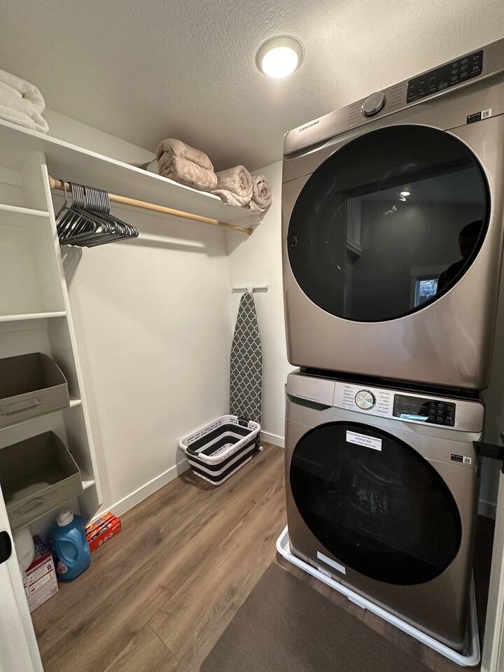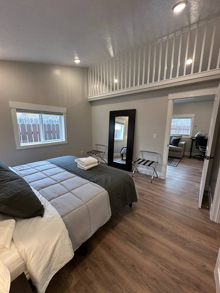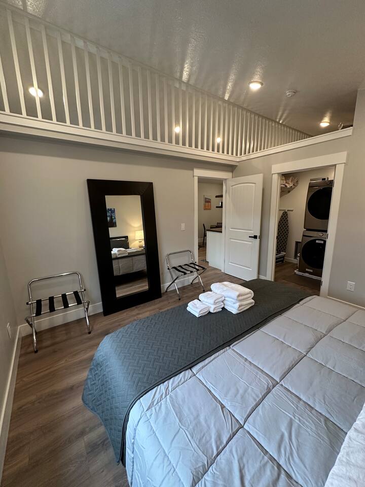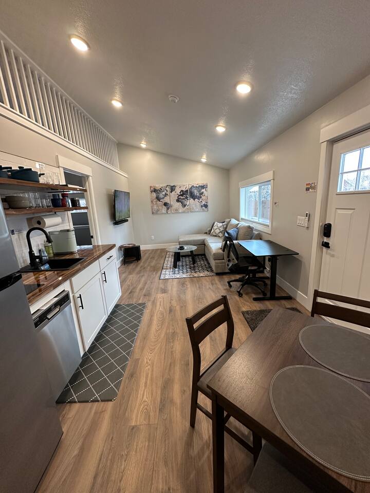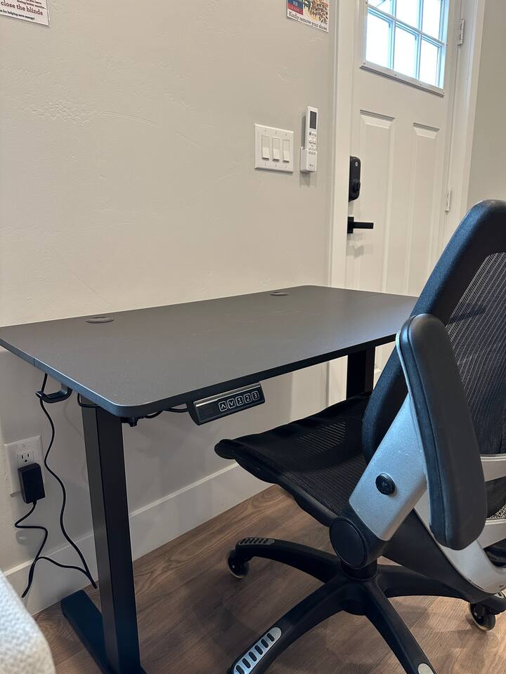 Enjoy comfort and convenience in this brand-new space featuring a king-size memory foam mattress for restful nights, and a 55" Smart TV with Sony surround sound for an immersive entertainment experience. The dedicated workspace with a height-adjustable standing desk and ergonomic office chair ensures productivity. The kitchen is outfitted with a two-burner cooktop and an air fryer since there is not an oven for all your cooking needs. Stay comfortable year-round with the Mini Split heating and cooling system, and enjoy fast, reliable WiFi. With great restaurants, grocery stores, and public transportation (TRAX) just minutes away, everything you need is at your fingertips!
